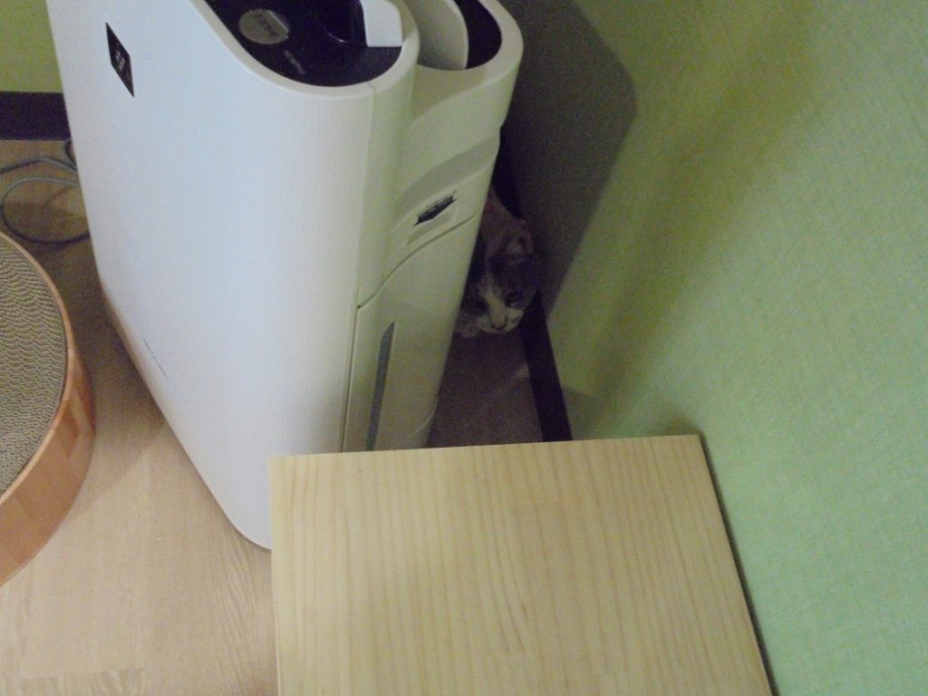 ベッドや空気清浄機の裏に隠れて、様子を伺っています。