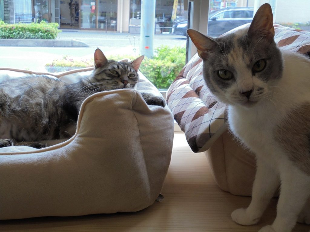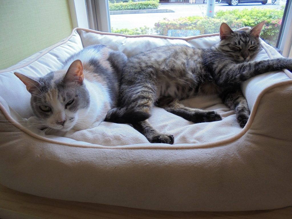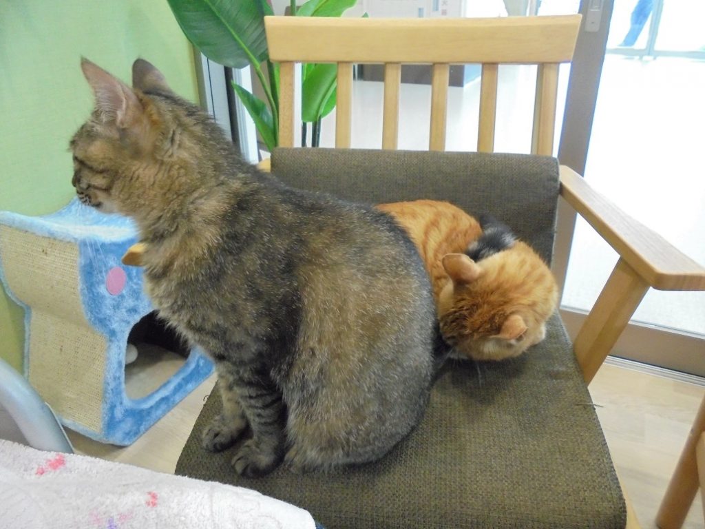 ご入居者様のお膝元で、しまくんを尻に敷くめいちゃん。マイペースです。