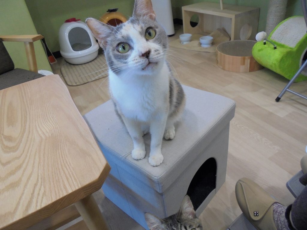 そしてご入居者様が座ると、ゴロンとテーブルを陣取るめい。