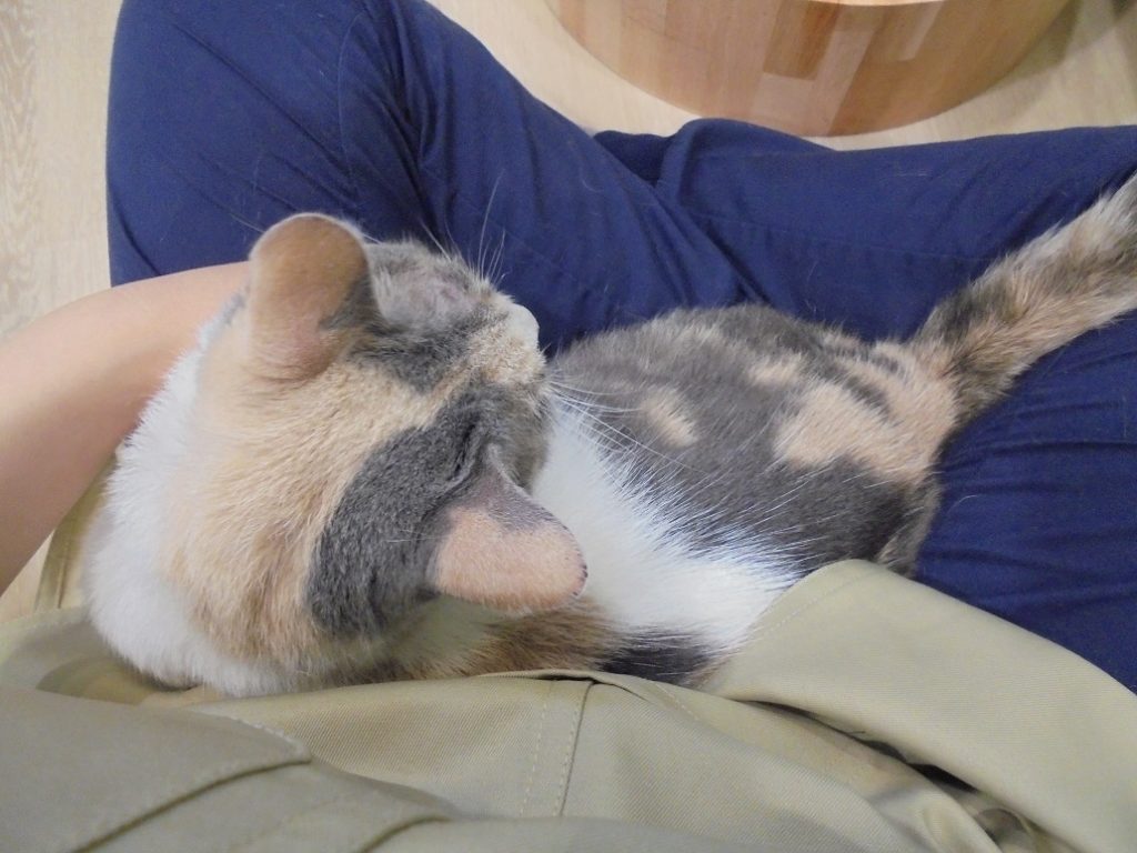 ふうちゃんはおひざの上から。最近はスタッフが地べたに座るとすぐ乗ってきます。椅子に座っていると乗ってくれないので、練習が必要ですね…!