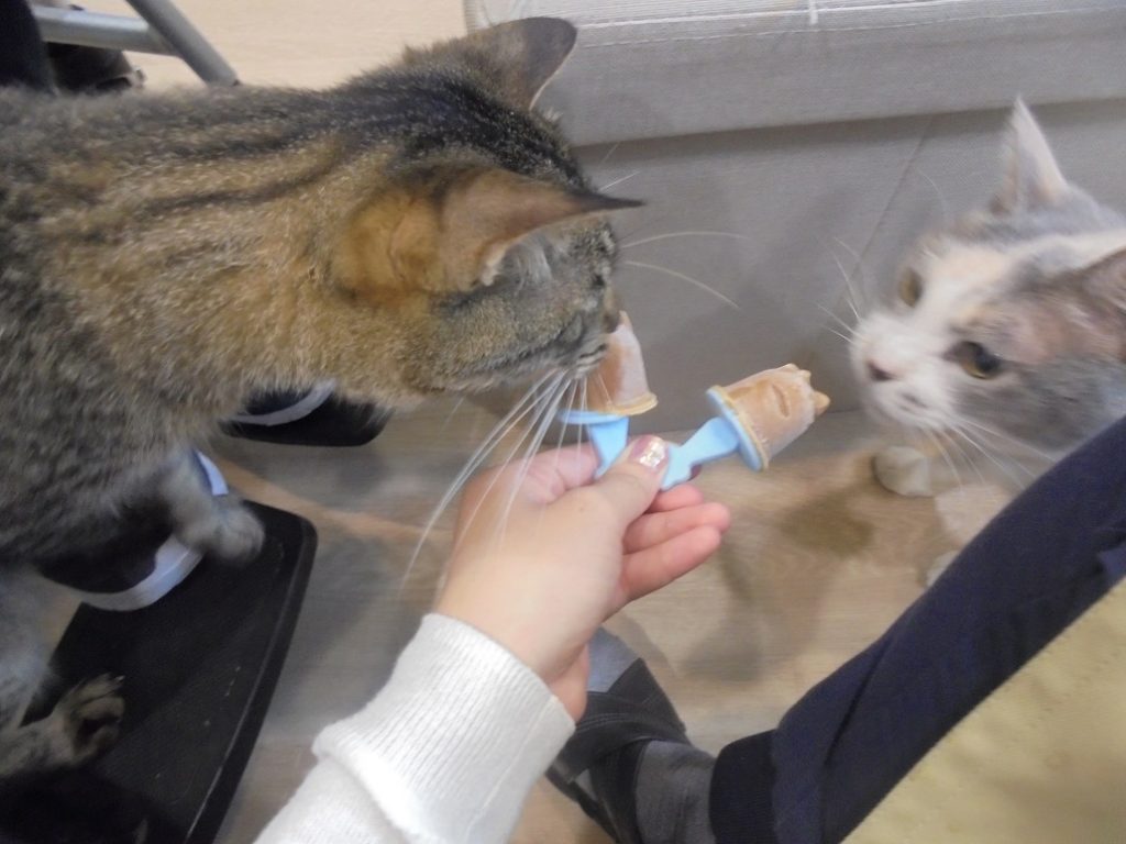 猫ちゃんたちは液体おやつのアイスを食べて水分補給しています。