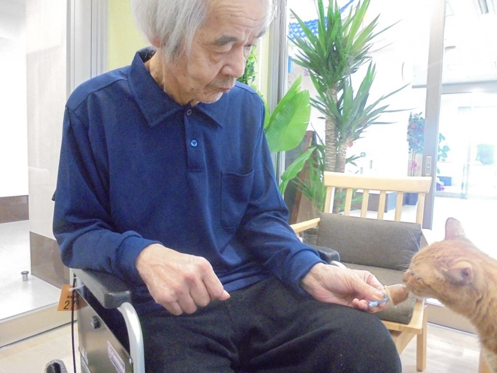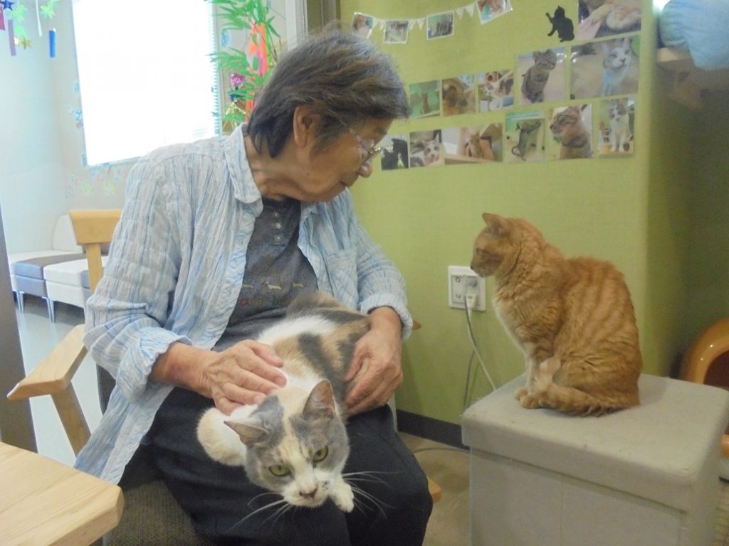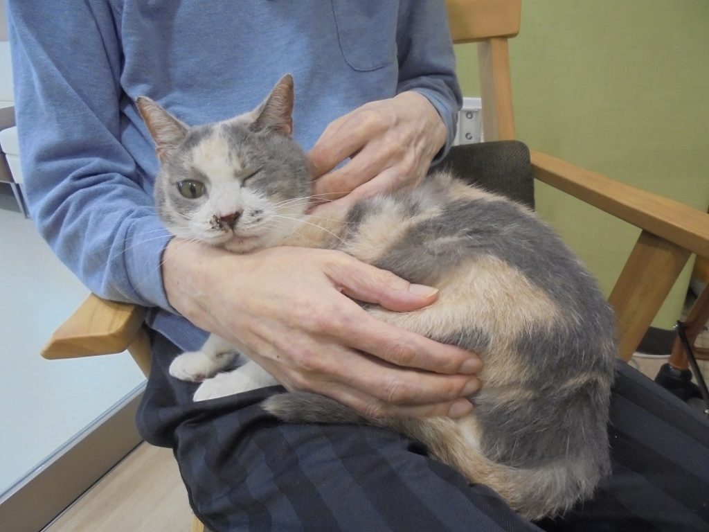 ふうちゃん、ご入居者様のお膝にお邪魔しています!!