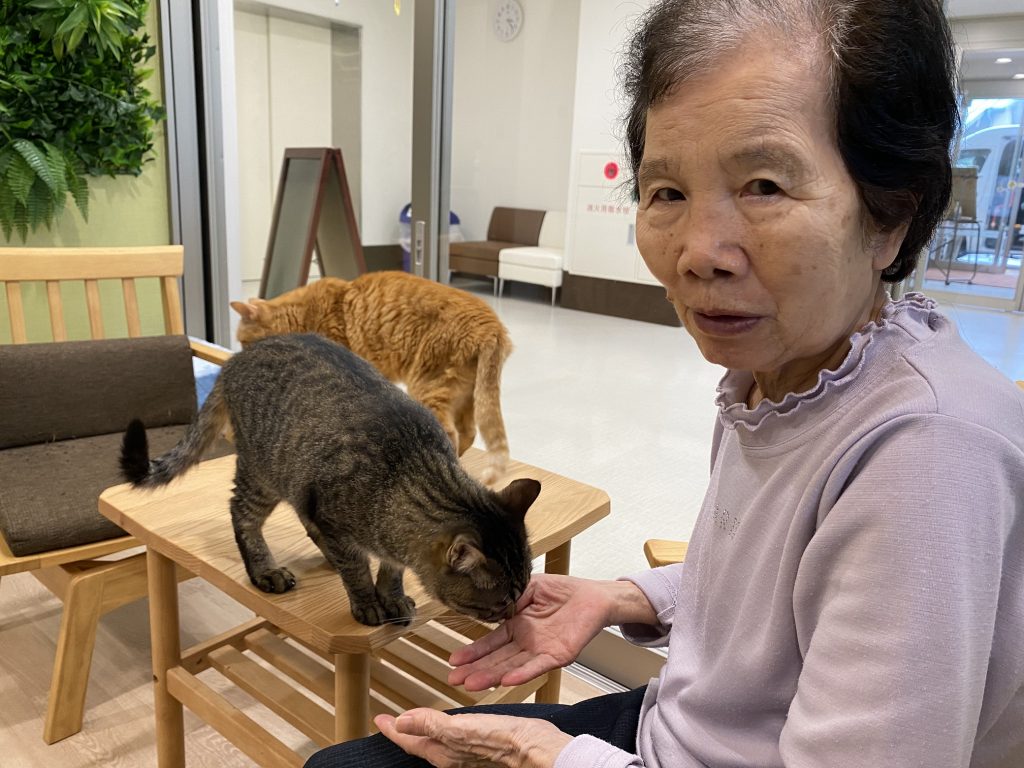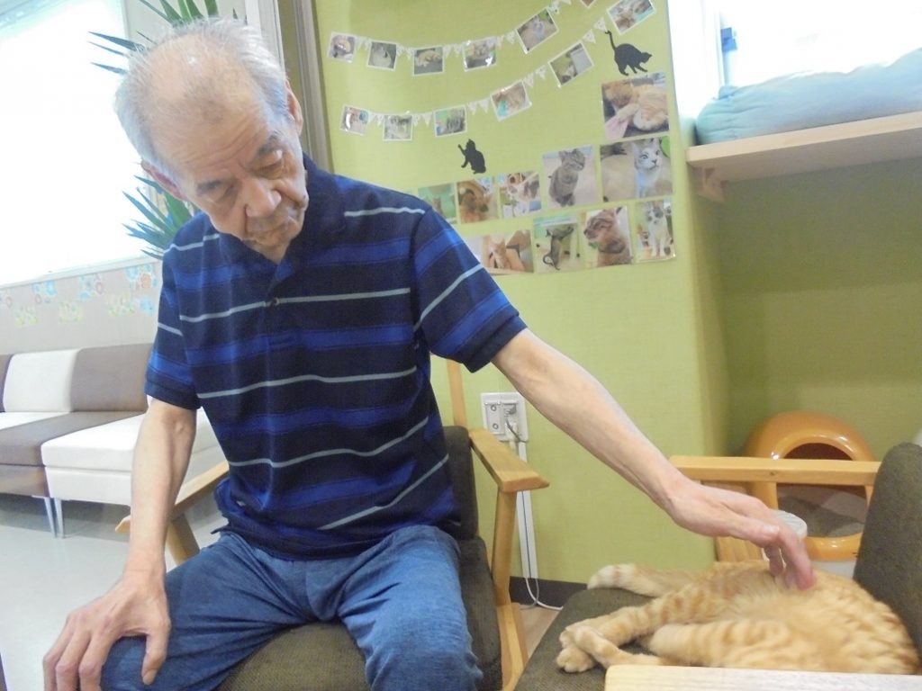 椅子が定位置のしまくんは、いつもご入居者様にご挨拶、したり寝ていたりの気まぐれキャットです。