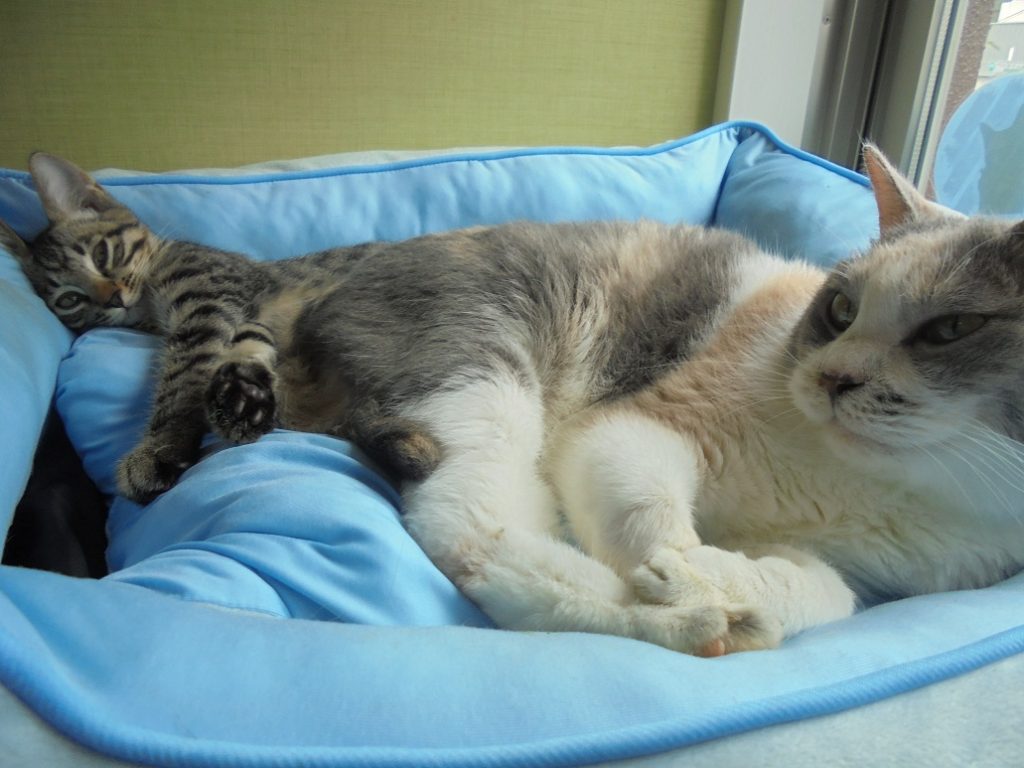 めいちゃんをはじめ、しまくんとめいちゃんも子猫がいる生活に慣れてきています。想像していたより早く打ち解けてくれそうで安心しました♪