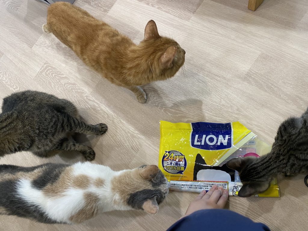 ガサゴソした音はご飯と勘違いされ、4匹がわらわら寄ってきます。