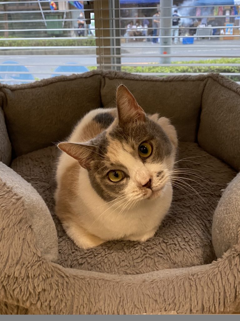 撫でられ待ちのしまくん。しまくんは黄色が好きなようで、黄色いアイテムをもっていると必ず近づいています。猫ちゃんは色の識別が人間よりも鈍いと聞きますが、黄色は分かるんでしょうか?オーラかな?